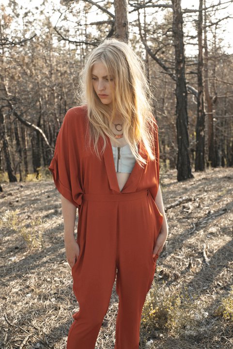 Third pic: We sell the jumpsuit in green with a a rusty red detail at the bottom of the trouser legs.